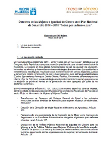 Documento informativo, elaborado por ONU Mujeres, sobre resultado final de la inclusión del enfoque de género en el Plan Nacional de Desarrollo 2014 -2018 "Todos por un nuevo país", el cual, de manera específica para las Mujeres, contempla cuatro artículos: Art. 67; Art. 107; Art. 129; Art. 232.