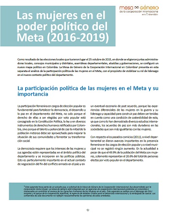 La Mesa de Género de la Cooperación Internacional (MGCI) presenta en esta separata un análisis de la participación política de las mujeres en el Meta, con el propósito de visibilizar su rol de liderazgo en el nuevo contexto político del departamento.